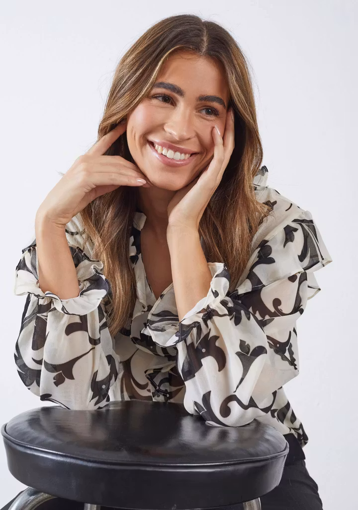 Vibse Flounce Blouse är en feminin blus med fokus på vackra detaljer och komfort. De volyminösa volangerna vid V-ringningen skapar ett vackert och livligt uttryck, medan de långa ärmarna med smockning och volangavslutning ger en elegant touch.